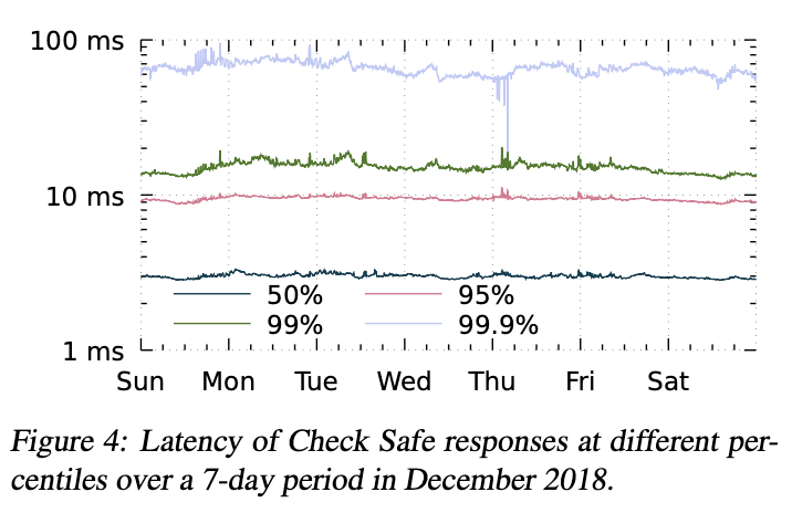 Figure 4 shows the latency of Check Safe responses over 7 days. At the 50th, 95th, 99th, and 99.9th percentiles it peaks at roughly 3, 11, 20, and 93 msec, respectively. This performance meets our latency goals for an operation that is frequently in the critical path of user interactions.